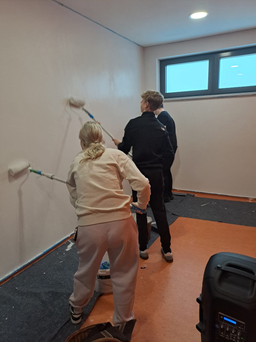 Unterstützt wurden sie dabei von Herrn Göse, der das Projekt begleitete, sowie von der Malerfirma Falk Wostal aus Wiederstedt. Die Firma stellte nicht nur ihr Fachwissen zur Verfügung, sondern auch sämtliche Materialien: Farbe, Pinsel, Rollen, Abdeckvlies und Leitern. Durch die professionelle Anleitung konnten die Schülerinnen und Schüler nicht nur tatkräftig mithelfen, sondern auch praktische Einblicke in handwerkliche Arbeitsabläufe gewinnen.