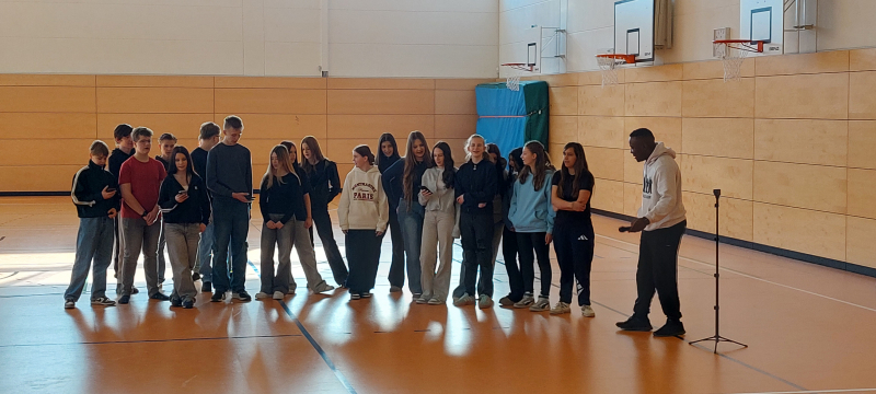 Freitag, 27.02.26 - Die diesjährige Projektwoche erreichte heute ihren Höhepunkt: Team 8 durfte in intensiven Rapworkshops mit Matondo Castlo kreativ werden und sich mit großer Offenheit und Tiefe gegen Rassismus und für Vielfalt einsetzen. Die Begeisterung war in allen Gruppen spürbar. Mit viel Mut, Energie und persönlichem Ausdruck präsentierten die Schülerinnen und Schüler heute ihre selbstgeschriebenen Rapsongs – ein Moment, der das Publikum sichtbar bewegte.